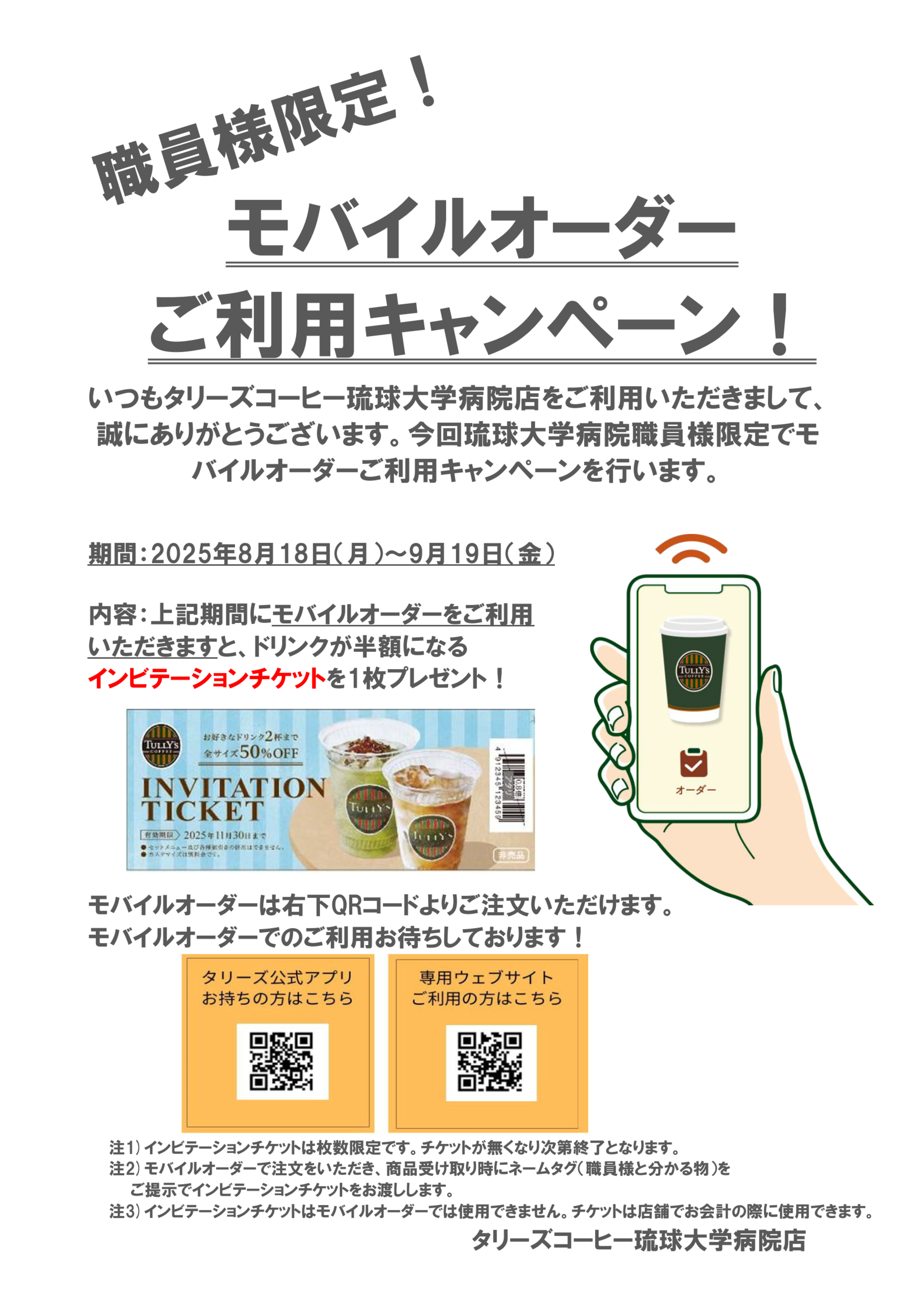 今回琉球大学病院職員様限定でモバイルオーダーご利用キャンペーンを行います。